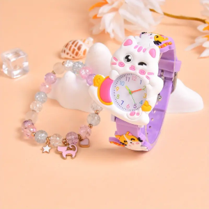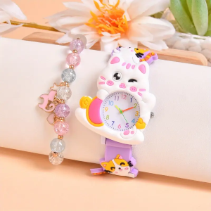 Orologio da polso bambina con braccialetto abbinato con ciondolo gattino, colori sul rosa e sul viola, non selezionabili